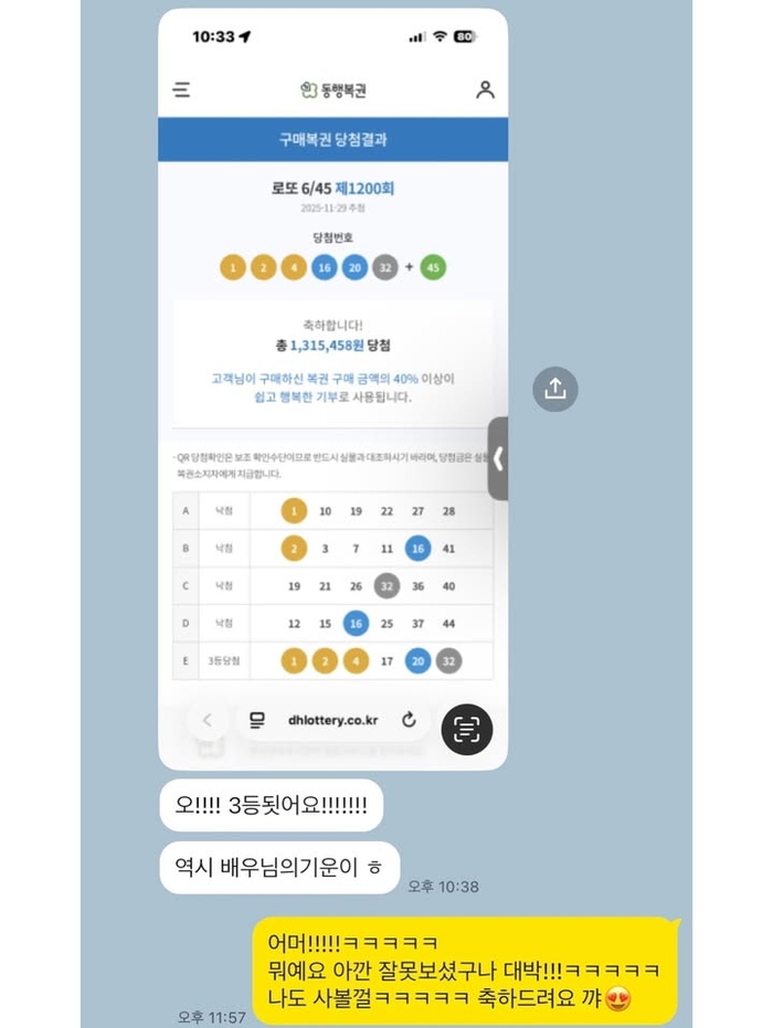 실제로 박하선은 소속사 매니저와 나눈 카카오톡 대화 내용을 공개한 바 있다. 매니저는 숫자 한 개만 틀려서 3등이었는데, 박하선도 깜짝 놀라며 “대박! 나도 사볼 걸. 축하드려요”라고 기쁨을 공유하기도 했다. roku@sportsseoul.com