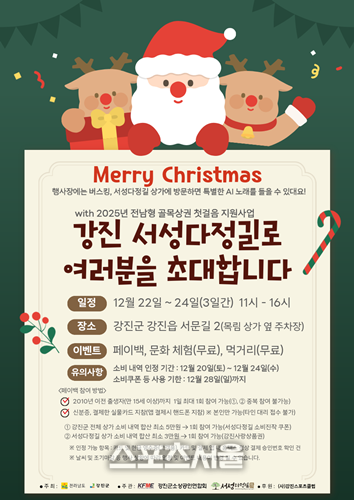 김혜정 강진군 축제마케팅추진단장은 스포츠서울과 통화에서 “이번 크리스마스 행사는 지역 상권에 온기를 불어넣고, 군민과 방문객 모두가 함께 즐기는 연말 축제로 마련한 자리”라며 “골목상점가를 중심으로 다양한 행사를 지속 발굴해 지역경제를 활성화하겠다”고 말했다.