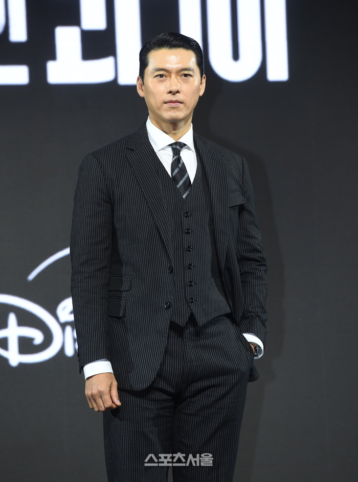 배우 현빈이 15일 서울 강남구 그랜드 인터컨티넨탈 파르나르에서 진행된 디즈니+ 오리지널 시리즈 ‘메이드 인 코리아’ 제작발표회에서 취재진을 향해 포즈를 취하고 있다.