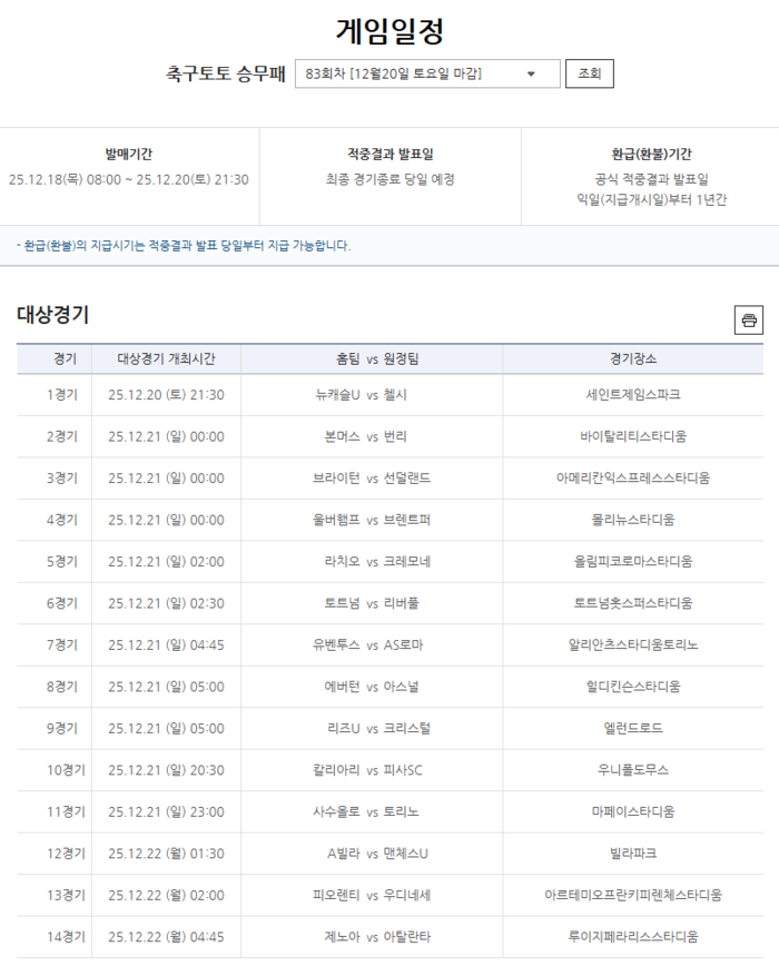 한편 18일 오전 8시부터 20일 오후 9시30분까지 발매되는 축구토토 승무패 83회차에는 EPL과 세리에A의 주요 빅매치가 대거 포함됐다.
