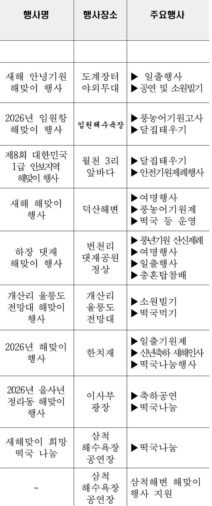 새해 첫날인 1월 1일 새벽에는 관내 9개 읍면동에서 해맞이 행사가 동시에 열린다. 난타 공연과 사물놀이 등의 여명 행사와 함께 신년 축하 메시지 낭독과 해맞이 징치기, 떡국·어묵국 나눔 행사 등 지역별로 다채로운 행사가 이어져 시민과 관광객이 새해의 희망을 나누는 뜻깊은 시간이 될 전망이다.