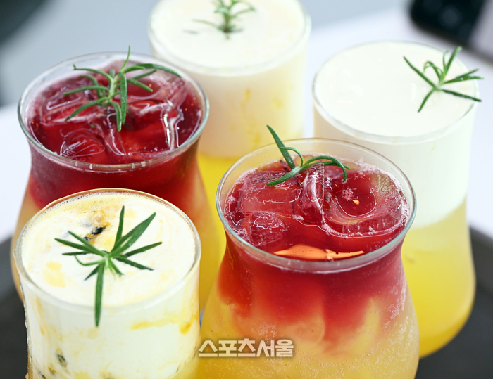 특히 석류와 오렌지를 조합한 에이드는 상단의 붉은 석류와 하단의 오렌지가 그라데이션을 이루며 시각적 즐거움을 선사한다. 로즈마리 향이 은은하게 퍼지며 청량감을 더한다. “음료도 그림처럼 아름다워야 한다고 생각해요. 색의 조화와 향의 균형을 중요하게 여기죠”라고 이씨는 말한다.
