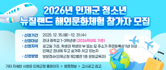 [스포츠서울ㅣ김기원기자]인제군이 오는 31일까지 ‘2026년 인제군 청소년 뉴질랜드 해외문화체험’ 참가자를 모집한다고 밝혔다.