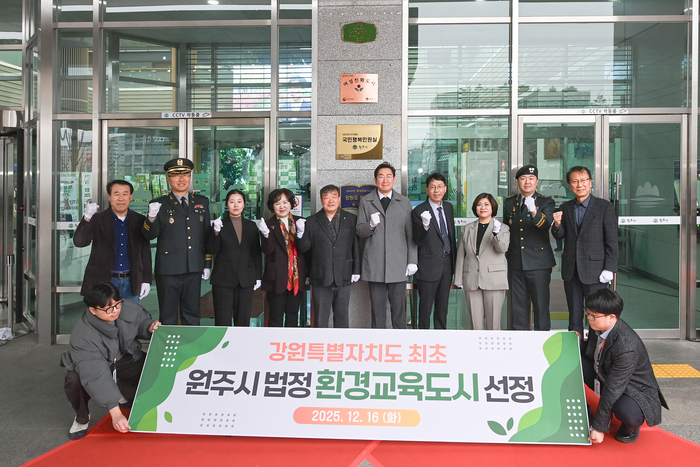 [스포츠서울ㅣ원주=김기원기자]원주시는 12월 16일(화) 시청사 입구에서 강원특별자치도 최초 ‘환경교육도시’지정을 기념하기 위한 현판 제막식을 개최했다.