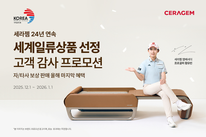 세라젬은 세계일류상품 24년 연속 선정을 기념해 고객 감사 프로모션도 진행한다. ‘마스터 V 컬렉션’을 대상으로 일시불 구매 시 최대 60만 원 할인 혜택을 제공하며, 구독 이용 시에는 매월 최대 1만 원, 연간 약 12만 원의 혜택을 받을 수 있다. 이번 프로모션은 내년 1월 1일까지 이어진다.