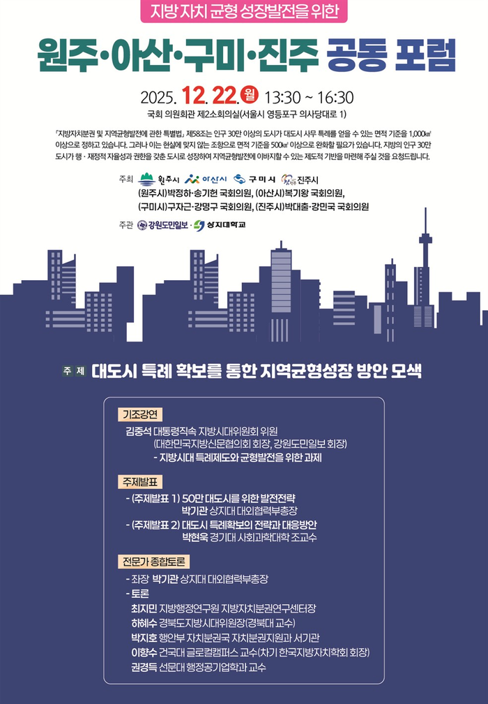[스포츠서울ㅣ원주=김기원기자]원주·아산·구미·진주시는 오는 12.22.(월) 14:00에 국회의원회관 제2소회의실에서 지방자치 균형성장발전을 위한 ‘원주·아산·구미·진주 공동 포럼’을 개최한다.