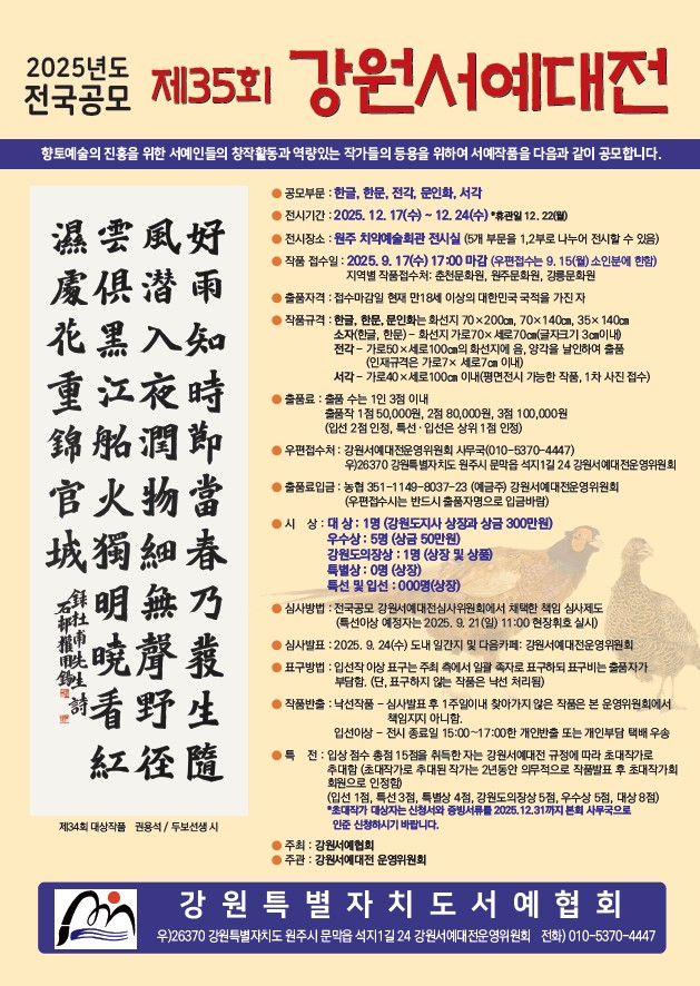 강원서예대전은 오랜 세월 동안 전통 서예의 정신을 계승하고 그 아름다움을 널리 알리는 데 큰 역할을 해왔다. 이번에는 한글, 한문, 전각, 문인화, 서각 총 다섯 부문에서 수상한 작품들을 전시하여 시민들에게 서예 작품의 멋스러움을 선보일 것으로 기대된다.