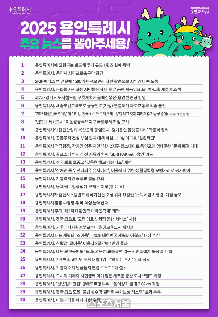 후보로 선정된 주요 뉴스는 ▲반도체 투자 규모 1천조 원에 육박 ▲시민프로축구단 창단 ▲SK하이닉스 팹 건설에 4500억원 규모 용인자원 활용으로 지역경제 큰 도움 ▲문화를 사랑하는 시민들에게 더 좋은 공연 제공위해 포은아트홀 새롭게 조성 ▲제2차 경기도 도시철도망 구축계획에 동백신봉선·용인선 연장 반영 ▲세종포천고속도로 동용인IC(가칭) 연결허가 국토교통부 최종 승인 ▲‘2025 대한민국 조아용 페스티벌, 전국 최초 캐릭터 축제...용인 대표 축제 자리매김 가능성 열어(4만5천여 명 참여) ▲‘반도체 특화도시’ 이동공공주택지구 국토부서 지정 고시 ▲첨단산업과 복합문화 중심도시 ‘경기용인 플랫폼시티’ 착공식 열려 ▲ 공동주택 건설 부실 방지 대책 마련...부실 아파트 ‘원천차단’ ▲적극행정, 장기간 입주 지연 ‘삼가2지구 힐스테이트 용인포레 임대주택’ 문제 해결 기대 ▲골프스타 박세리 전 감독과 함께 ‘SERI PAK with 용인’ 개관 ▲전국 최초 초중고 ‘맞춤형 학교 제설지도’ 제작 ▲ ‘장애인 등 우선배려 주유서비스’, 이동약자 위한 생활밀착형 모범사례로 평가받아 ▲기흥역세권 중학교 설립 건의 ▲용인특례시, 올해 골목형상점가 15개소 지정(총 21호) ▲첨단시스템반도체 국가산단 조성 위해 요청한 ‘소득세법 시행령’ 개정 공포 ▲ 공공 수영장 두 배 이상 늘어난다 ▲ ‘제2회 대한민국 대학연극제’ 개막 ▲전국 최초로 ‘고령 어르신 차량 동행기후에너지환경부로부터 환경교육도시 재지정 ▲ ‘조아용’, ‘2025 대한민국 캐릭터 어워즈’ 대상 수상 ▲산책앱 ‘걸어용’ 이용자 2달만에 1만명 돌파 ▲내년 모현읍에도 ‘똑버스’ 운영 교통불편 겪는 시민들에게 도움 줄 계획 ▲7년 연속 경기도 도서 대출 1위...‘책 읽는 도시’ 위상 떨쳐 ▲기흥저수지 인공습지 연결 보도교 2개 설치 ▲ 도시의 미래와 시민행복 의미 담은 새로운 통합 도시브랜드 확정 ▲‘청년김대건길’ 명예도로명 부여...은이성지 일대 2.89km 지정 ▲전국 최초 도입 ‘불법 현수막 원터치 수거보상 시스템’ 효과 톡톡 ▲ 아열대작물 바나나 첫 수확 등 30개다.