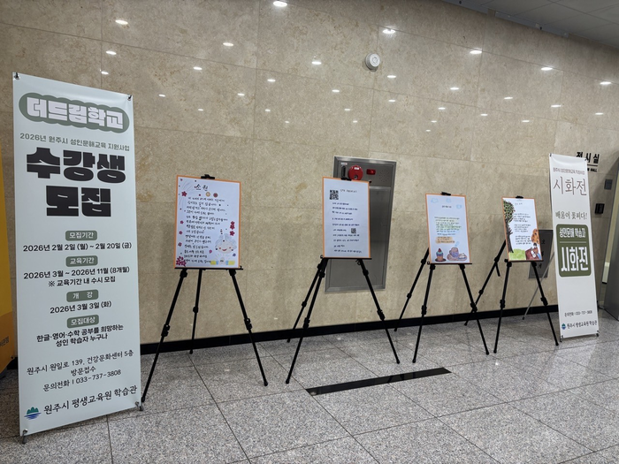 한편, 2026년부터 원주시 성인문해교육 지원사업은 「더드림학교」로 개편·운영된다. 교육은 더디딤(단계별 한글문해), 더채움(생활문해), 더열림(찾아가는 성인문해), 더터치(디지털문해) 등으로 구분해 문해교육의 질과 접근성을 강화할 예정이다.