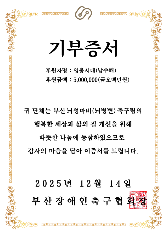 지난 14일 부산 영웅시대 남수해는 부산뇌성마비축구단(fc오뚜기)에 후원금 500만 원을 기부했다.