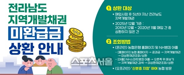 [스포츠서울|조광태기자] 전라남도가 오는 31일까지 보름여간 2025년 전남도 지역개발채권 미환급금 일제상환 기간을 운영, 도민 권리 보호에 나선다고 밝혔다.