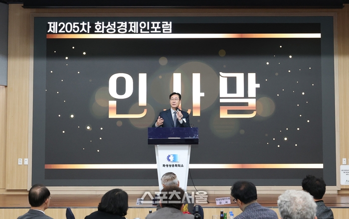 〔스포츠서울│화성=좌승훈기자〕정명근 화성특례시장은 16일 화성상공회의소 컨벤션홀에서 열린 ‘제205차 화성경제인포럼’에서 “올해 내수 둔화, 통상 리스크, 고환율 등 불확실한 경영 여건 속에서도, 각자의 자리에서 끊임없이 도전과 혁신을 이어오신 기업인분들께 존경을 표한다”며 “기업의 지속가능한 성장 기반을 구축할 수 있도록 기업이 함께 힘을 모아주기 바란다”고 말했다.