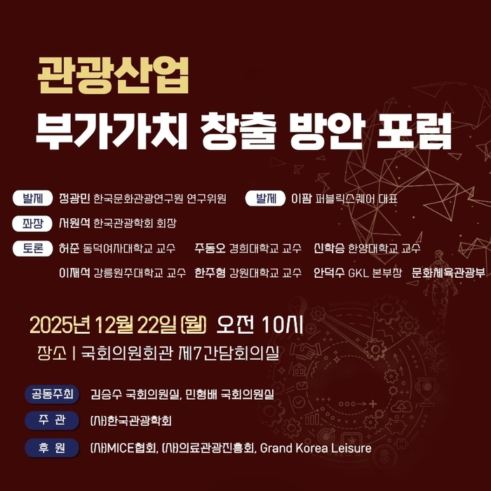 ‘관광산업 부가가치 창출 방안 포럼’은 국회 문화체육관광위원회의 김승수 의원, 민형배 의원이 공동주최하고 한국관광협회가 주관하는 행사다. 관광객 3천만 명 시대에 대비하여 관광산업의 미래 경쟁력 강화와 고부가가치 관광 수요 증가에 대한 대응 전략을 논의하고자 마련됐다.