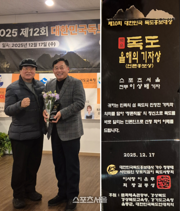 ‘(사)영토지킴이독도사랑회’가 주최하는 이번 시상식은 올 한해 독도수호 활동에 기여한 개인·단체를 격려하기 위한 행사로서 지난달 25일까지 후보자를 접수하고, 엄격한 심사를 거쳐 28일 수상자를 최종 선정했다. 이 자리에 본사 이상배 전무 겸 전문기자가 영광스럽게 대상자로 선정되어 수상의 영예를 안았다.