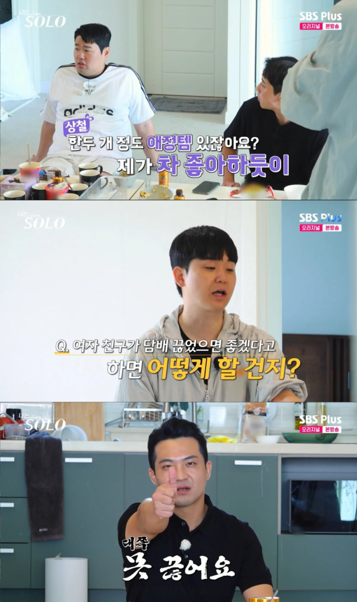 영수는 “여자 친구가 담배를 끊으면 좋겠다고 하면 어떻게 할 거냐. 카메라 앞에 두고 맹세해라”라고 질문했다. 그러자 영철은 자신있게 카메라를 보며 “못 끊어요”라고 단호하게 말했다.