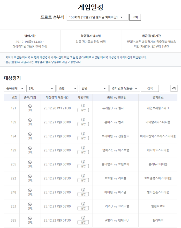 이번 프로토 승부식 150회차에서 EPL을 대상으로 하는 경기는 ▲뉴캐슬-첼시 ▲본머스-번리 ▲브라이턴-선덜랜드 ▲맨시티-웨스트햄 ▲울버햄프턴-브렌트퍼드 ▲토트넘-리버풀 ▲에버턴-아스널 ▲리즈유나이티드-크리스털팰리스 ▲아스톤빌라-맨체스터유나이티드전이다.