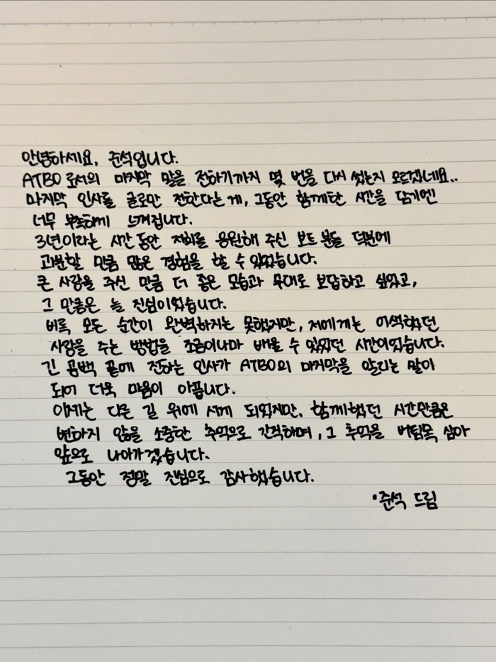[스포츠서울 | 박진업 기자]그룹 ATBO의 리더 준석이 팀 해체와 관련해 팬들에게 마지막 작별 인사를 전했다. 준석은 18일 자신의 SNS 채널에 한글 자필 편지와 영문 메시지를 게재하며 팬들을 향한 진심 어린 소회를 밝혔다.
