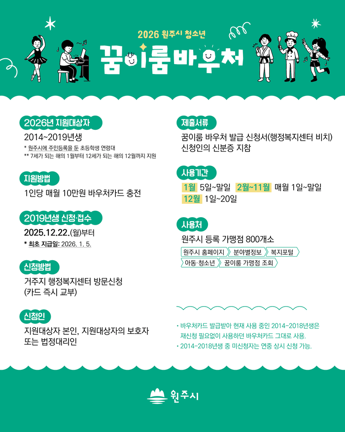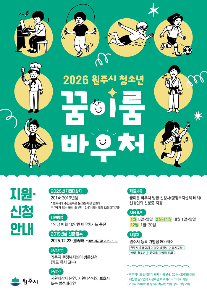 [스포츠서울ㅣ원주=김기원기자]원주시는 오는 22일부터 지역 아동의 건전한 성장을 지원하기 위한 ‘2026년 원주시 청소년 꿈이룸 바우처’ 신규 이용자 모집을 시작한다.