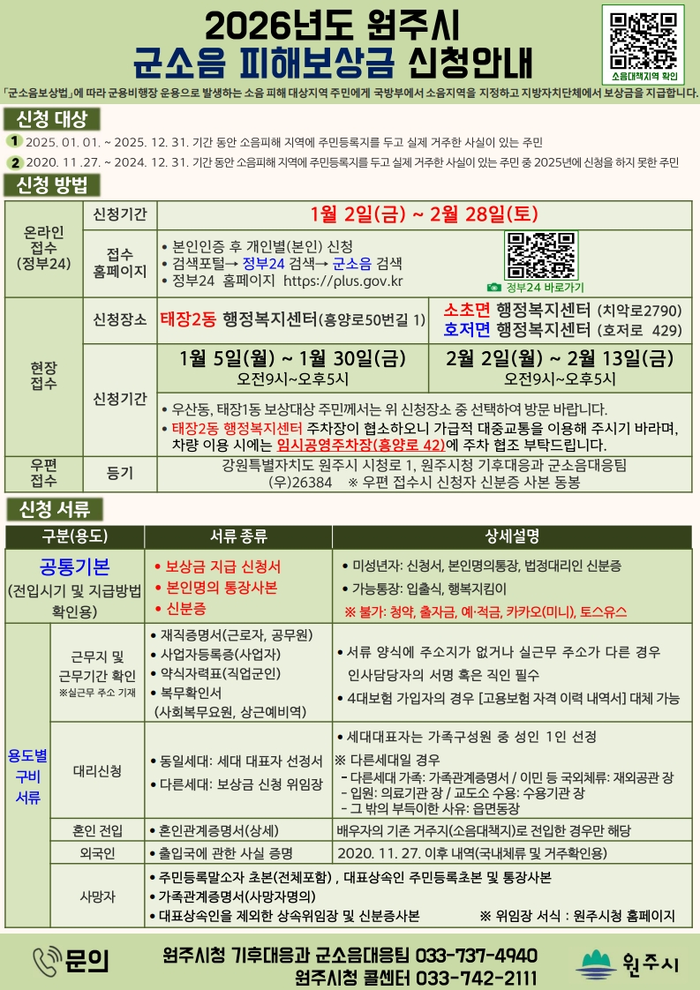 [스포츠서울ㅣ원주=김기원기자]원주시는 내년 1월부터 2월까지 ‘2026년 군소음 피해보상금’ 신청을 접수한다.