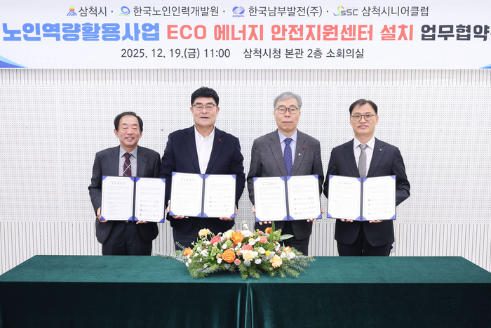 [스포츠서울ㅣ김기원기자]삼척시는 12월 19일 한국노인인력개발원, 한국남부발전(주) 삼척빛드림본부, 삼척시니어클럽과 함께 신규 어르신 일자리 창출사업으로 ‘Eco에너지 안전지원센터’ 운영을 위한 업무협약을 체결했다.