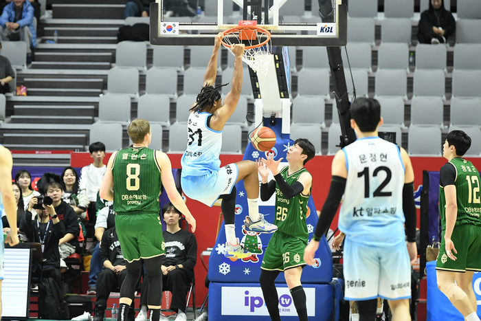 DB는 19일 수원KT소닉붐아레나에서 열린 2025~2026 LG전자 프로농구 수원 KT와 맞대결에서 83-81로 이겼다. 이날 엘런슨은 개인 커리어 하이인 38점을 적었다.