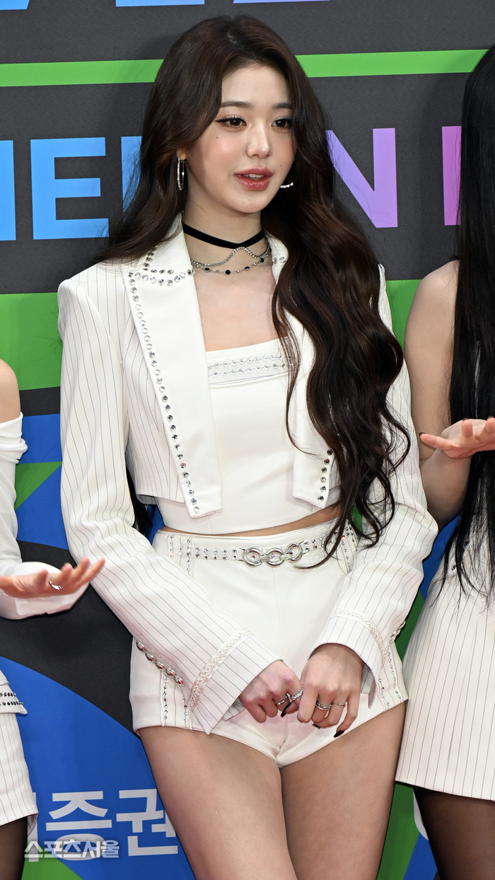이날 장원영은 올화이트 컬러의 슈트 스타일링을 선보였다. 핀스트라이프 패턴이 돋보이는 화이트 재킷을 메인으로 착용했으며, 재킷 라인을 따라 크리스탈 스터드 장식을 더해 화려함을 강조했다.