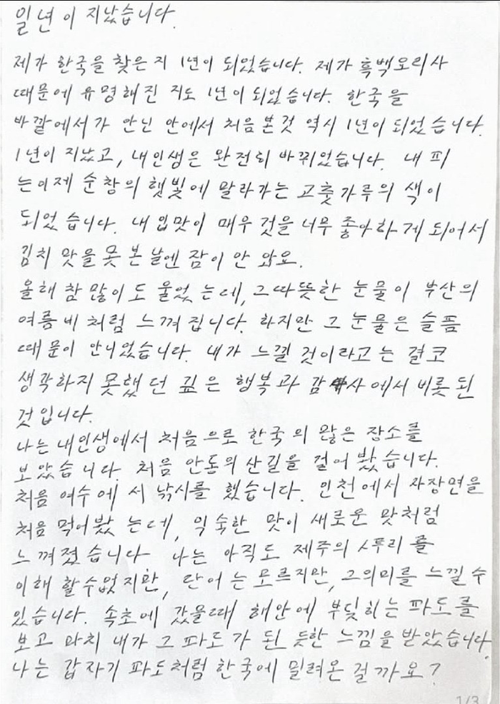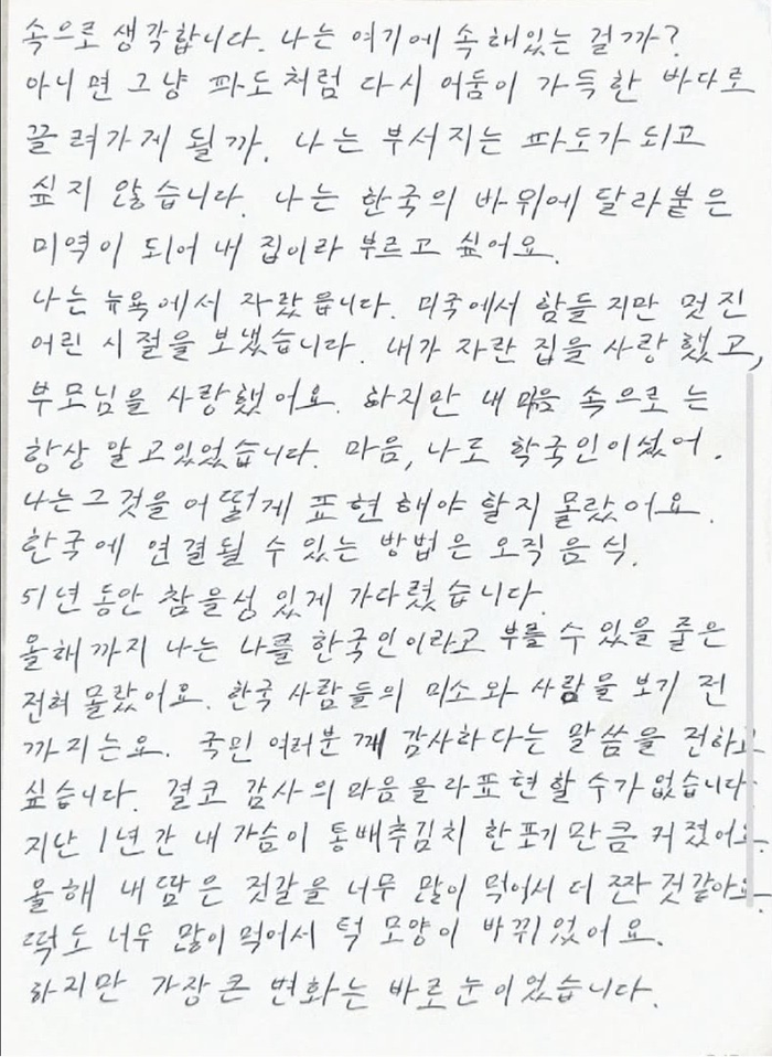그는 “한국을 찾은 지 1년이 지났고, 그 사이 내 인생은 완전히 바뀌었다”며 “내 입맛이 매우 강한 김치를 좋아하게 됐고, 김치 맛을 처음 온전히 느낀 날에는 잠이 오지 않을 정도였다”고 적었다. 이어 “눈물도 많이 흘렸지만, 그것은 슬퍼서가 아니라 내가 예상하지 못했던 깊은 행복과 감동 때문이었다”고 고백했다.