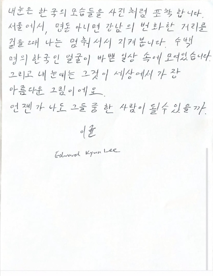 마지막으로 에드워드 리는 “지난 1년 동안 내 가슴은 통배추김치 한 포기만큼 커졌고, 올해는 떡을 너무 많이 먹어 턱 모양이 바뀐 것 같지만 가장 큰 변화는 바로 두 눈이었다”며 “이제 내 눈은 서울, 명동, 강남의 변화하는 거리와 수백만 명의 한국인 얼굴이 섞인 일상을 세상에서 가장 아름다운 그림으로 포착한다”고 적었다. 그는 “언젠가 나도 그들 중 한 사람이 될 수 있을까”라는 문장으로 편지를 마무리했다.