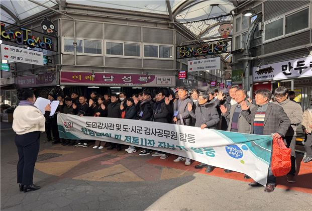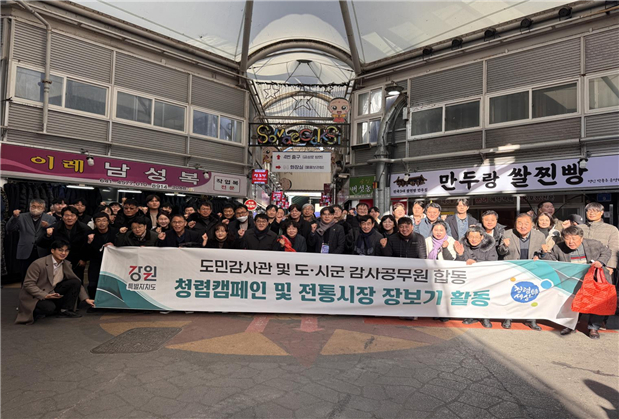[스포츠서울ㅣ춘천=김기원기자]강원특별자치도 감사위원회(위원장 정일섭)는 12월 19일 ‘2025년 도민감사관 워크숍’의 일환으로 강릉 중앙시장을 방문해 도민감사관과 도·시군 감사 공무원이 함께하는 전통시장 장보기 행사를 실시했다.