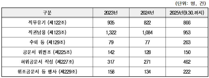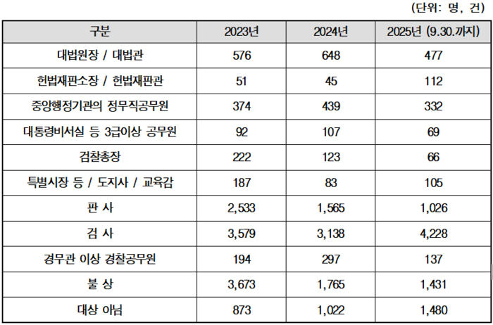 이는 공수처가 접수한 고위공직자 사건 중 가장 많은 것이다. △2023년 3579건 △2024년 3138건 △2025년(9월30일까지) 4228건이 접수됐는데, 검찰청 폐지 논의가 본격화한 올해 큰 폭으로 증가했다. 같은 기간 검찰총장에 대한 고소·고발(411건)까지 합하면 더 늘어난다.