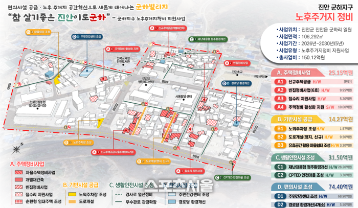 군하지구 노후주거지정비 지원사업은 진안읍 군하리 일원의 노후 저층주거 밀집지역으로 주택정비사업, 기반시설공급, 생활안전시설 조성 등 2026년부터 2030년까지 5년간 추진하게 된다.