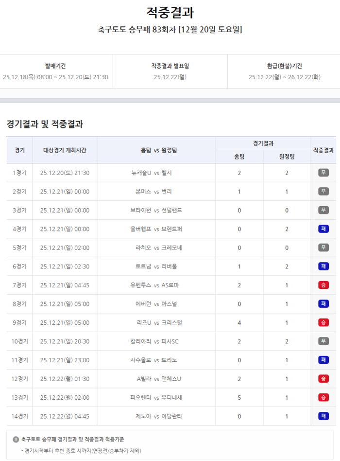 축구토토 승무패 83회차에서 선정된 14경기의 결과는 승(홈팀 승) 4경기, 무(무승부) 5경기, 패(원정팀 승) 5경기로 나타나는 등 무승부 결과가 다수 발생했다.