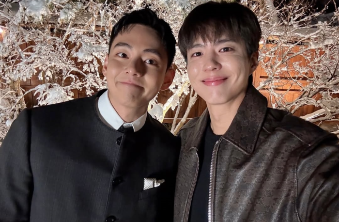 공개한 사진 속에서 뷔와 박보검은 같은 포즈를 취하거나 서로에게 기대는 모습으로 다정한 분위기를 드러냈다.