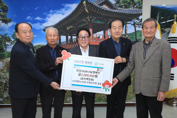 전국 | 강원 (사)대한노인회 인제군지회·서화1리 경로당, 희망2026나눔캠페인 성금 기탁 입력2025-12-23 11:01:44 북마크 페이스북 트위터 SNS 더보기 가글자크기설정 인쇄 SNS 더보기 닫기 네이버밴드 네이버블로그 URL복사 글자크기 설정 메뉴 닫기 글자크기 설정 시 다른 기사의 본문도동일하게 적용됩니다. 가 가 가 가 가 [스포츠서울ㅣ김기원기자](사)대한노인회 인제군지회·서화1리 경로당은 23일 인제군청을 방문해 희망2026나눔캠페인 성금을 기탁했다.acdcok4021@sportsseoul.com 기사추천 0