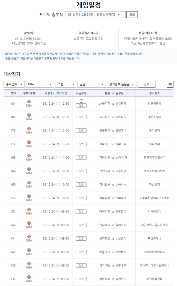 이번 프로토 승부식 151회차에는 크리스마스 주간에 열리는 다양한 NBA 경기들이 대거 편성됐다.