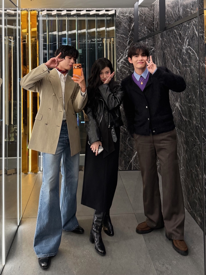 박보검은 베이지색 더블 브레스티드 재킷에 레드 스트라이프 스카프로 포인트를 주어 세련된 클래식 룩을 선보였으며, 수지는 블랙 가죽 재킷과 롱부츠로 시크하면서도 고혹적인 분위기를 자아냈다. 뷔는 퍼플 컬러 니트에 블랙 가디건을 매치해 특유의 부드럽고 몽환적인 매력을 뽐냈다.