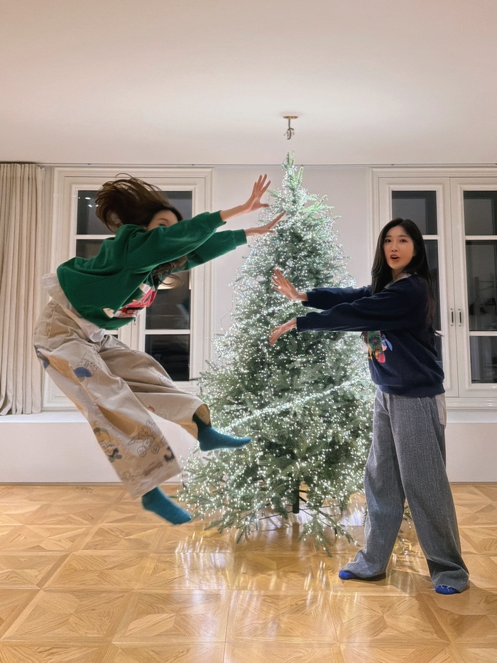 공개된 사진 속 두 사람은 반짝이는 대형 크리스마스트리 앞에서 편안한 홈웨어 차림으로 연말 분위기를 만끽하고 있다.