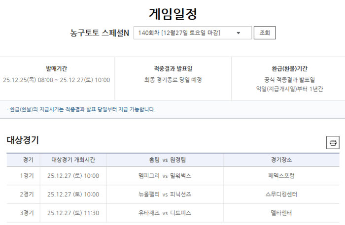 한편 NBA 3경기를 대상으로 한 농구토토 스페셜N 140회차는 25일 오전 8시부터 27일 오전 10시까지 발매를 진행한다.