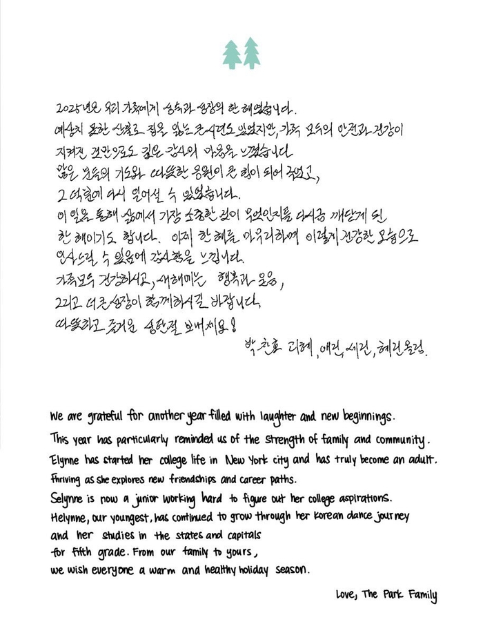 함께 공개된 편지에는 세 딸의 구체적인 근황도 담겼다. 장녀 애린 양은 뉴욕에서 대학 생활을 시작하며 성인으로서의 첫발을 내디뎠고, 차녀 세린 양은 대학 진학을 앞둔 주니어로 학업에 열중하고 있다. 한국 무용에 매진 중인 막내 혜린 양은 어느덧 5학년이 되어 훌쩍 자란 모습이다.