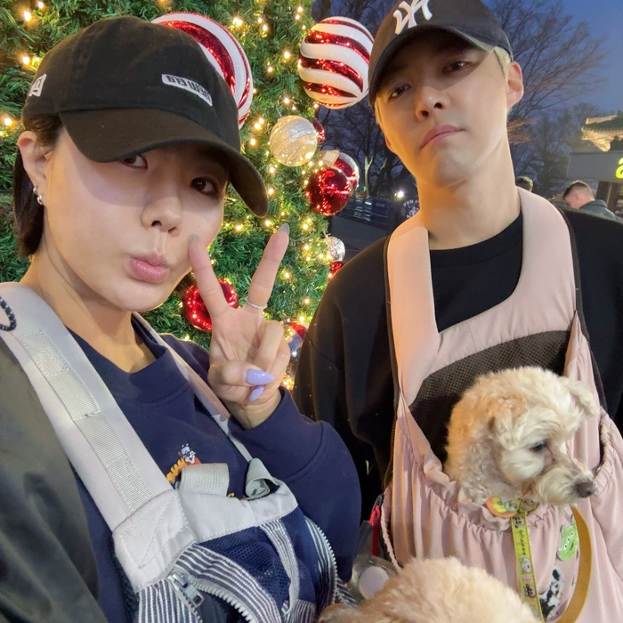 또 다른 사진에서는 반려견을 가슴에 품고 야외 나들이를 즐기는 모습도 포착됐다. 두 사람은 편안한 후드티와 캡모자 차림의 ‘시밀러 룩’을 연출하며 자연스러운 매력을 뽐냈다. 트리 조명 아래서 장난기 가득한 표정을 지어 보이며 화목한 분위기를 드러냈다.