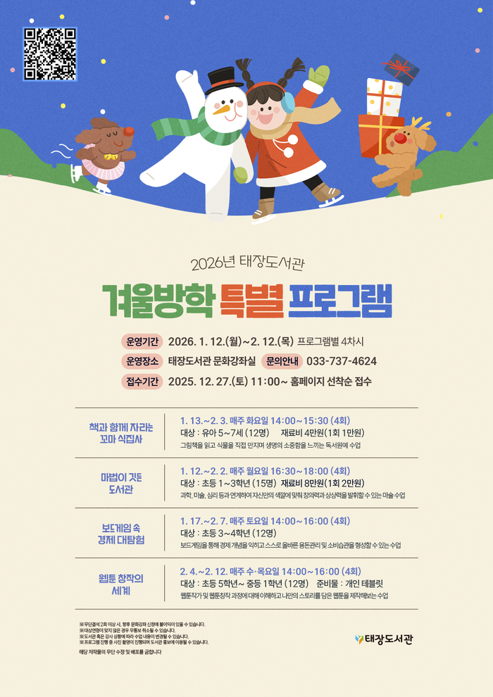 [스포츠서울ㅣ원주=김기원기자]원주시 태장도서관은 겨울방학을 맞아 1월 12일부터 2월 12일까지 겨울방학 특별 프로그램을 운영한다.