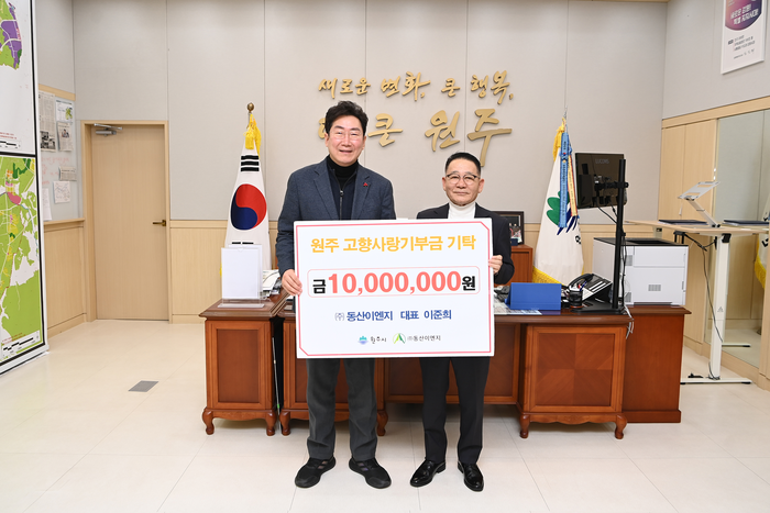 [스포츠서울ㅣ원주=김기원기자]㈜동산이엔지 이준희 회장은 지난 24일 원주시청을 방문해 고향사랑기부금 1천만 원을 기탁하며 따뜻한 나눔을 실천했다.
