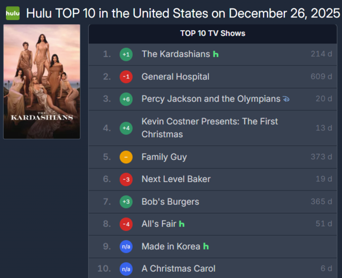 26일 기준 OTT 콘텐츠 순위 집계 사이트 플릭스패트롤(Flixpatrol) 디즈니+ TV쇼 부문에서 ‘메이드 인 코리아’는 한국 및 대만 1위, 일본 및 홍콩 3위, 싱가폴 6위를 기록했다. 또한 스트리밍 플랫폼 훌루(Hulu)에서 미국 9위에 오르며 전체 글로벌 차트 3위를 달성했다.