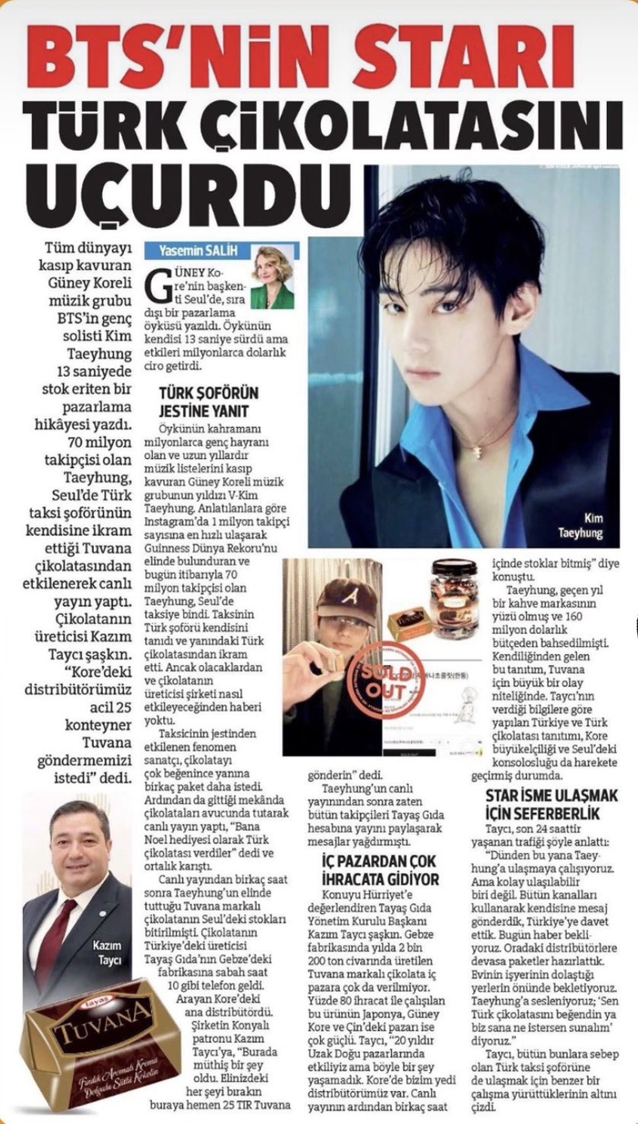 휘리예트는 “7000만 명의 팔로워를 보유한 김태형이 택시 기사가 건넨 투바나 초콜릿에 감명을 받아 라이브 방송을 진행했다. 이후 한국 유통업체에서 투바나 초콜릿 컨테이너 25개 분량을 긴급 주문했다”고 보도했다.