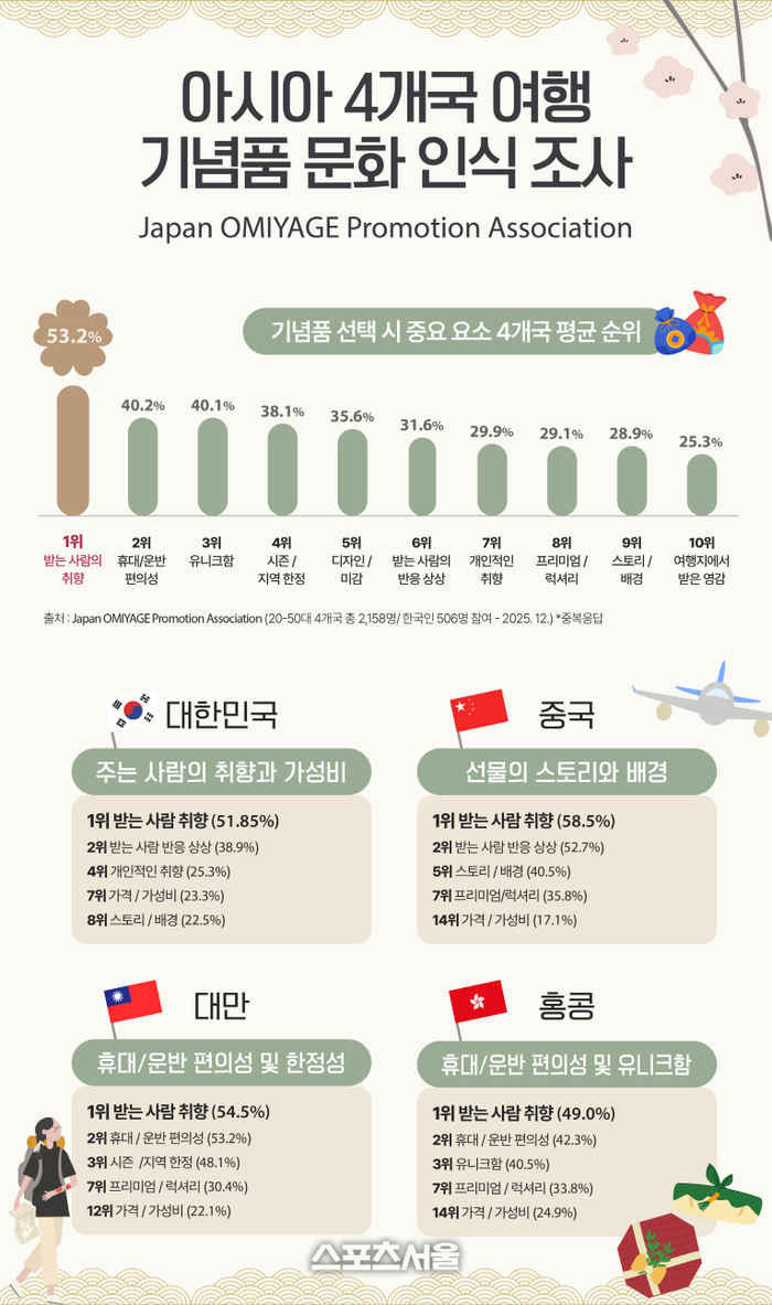 [스포츠서울 | 백승관 기자] 일본 오미야게 진흥협회(Japan OMIYAGE Promotion Association)가 한국·중국·대만·홍콩 등 아시아 4개국의 관광 소비자를 대상으로 ‘여행 기념품 문화 인식 조사’를 실시했다. 그 결과에 따르면, 한국 관광 소비자들은 기념품의 디자인이나 실용성보다 ‘받는 사람과 주는 사람의 취향’을 우선적으로 고려하는 경향을 보이는 것으로 나타났다.