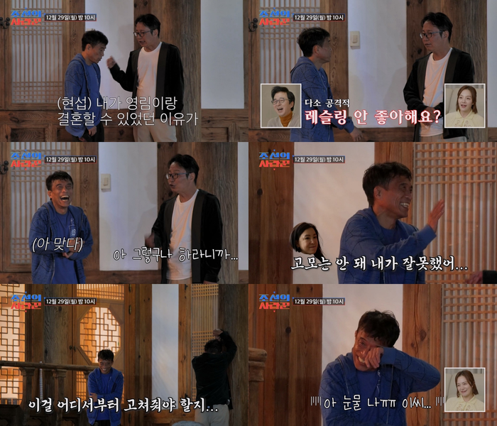 그리고 다시 “레슬링보다 태권도를 좋아해요”라고 말하는 심현섭에게 심권호는 “아, 예~ 그렇구나~”라고 배운 기술을 그대로 앵무새처럼 따라 했다. ‘53세 모솔의 벽’을 느낀 심현섭은 “나보다 더!”라는 단말마와 함께 무너져 내렸다. 이에 심권호도 “아 눈물 나...”라며 눈가를 닦아 안타까움을 자아냈다. sjay0928@sportsseoul.com