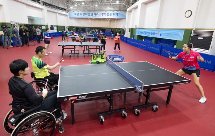 대한항공은 29일 오후 인천 서구 대한항공 탁구단 훈련장에서 대한항공 여자탁구단과 장애인 탁구선수들이 참여하는 ‘합동훈련 및 교류 행사’를 개최했다고 밝혔다. 이날 훈련에는 대한항공 소속 여자탁구단과 지도자, 장애인 탁구선수 및 보호자 등 50여 명이 참가했다.