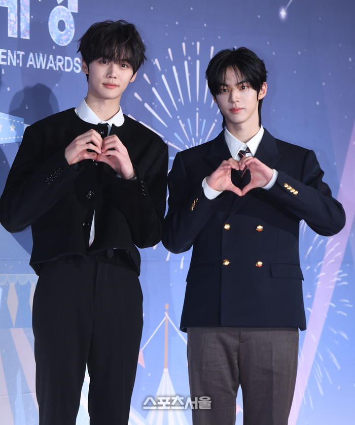 제로베이스원 규빈(왼쪽), 투어스 도훈이 29일 서울 상암동 MBC 미디어센터에서 열린 2025 MBC 방송연예대상 포토월에서 포즈를 취하고 있다.