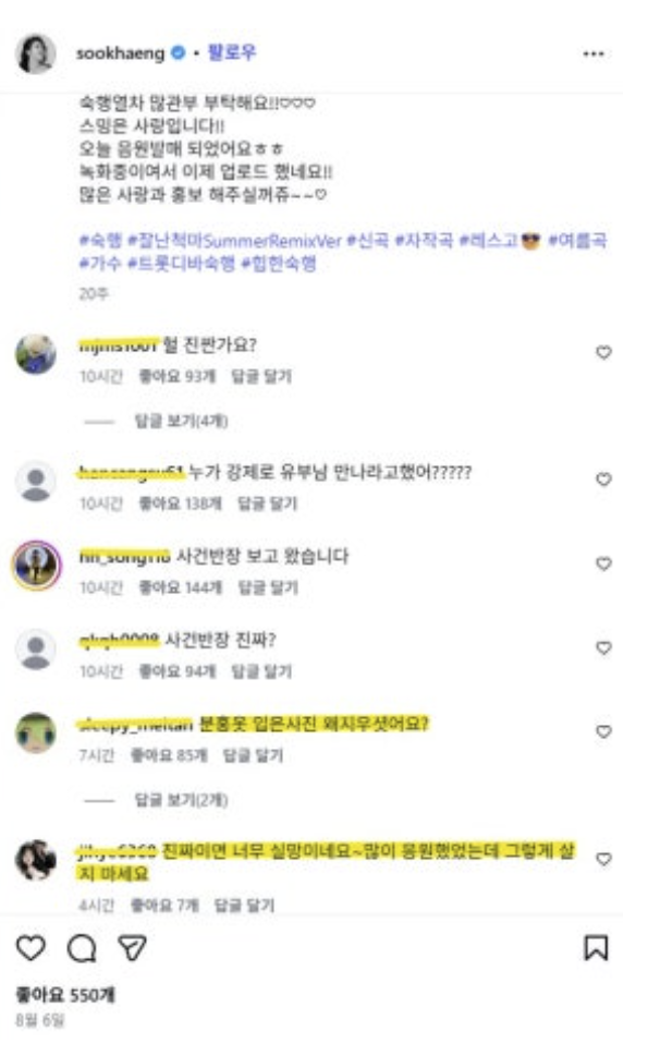 30일 오전 현재 숙행의 인스타그램은 팬들의 댓글이 빗발치고 있다. 팬들은 “사건 반장 사실 아니죠?”, “불륜이라니 거짓말이죠?”, “제발 아니길” 등 우려와 걱정 섞인 댓글이 이어졌다.
