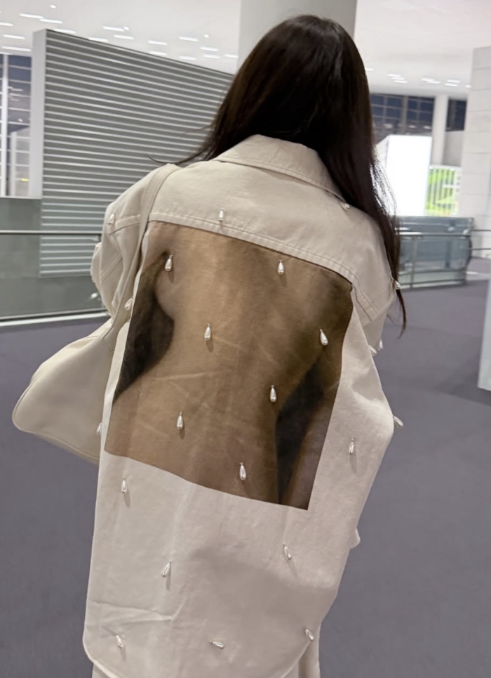 특히 재킷 뒷 부분이 여성의 뒷 모습으로 프린팅된 셔츠를 입은 효민은 백리스 의상을 입은 것 같은 착시 효과를 불러 일으키며 눈길을 사로잡았다.